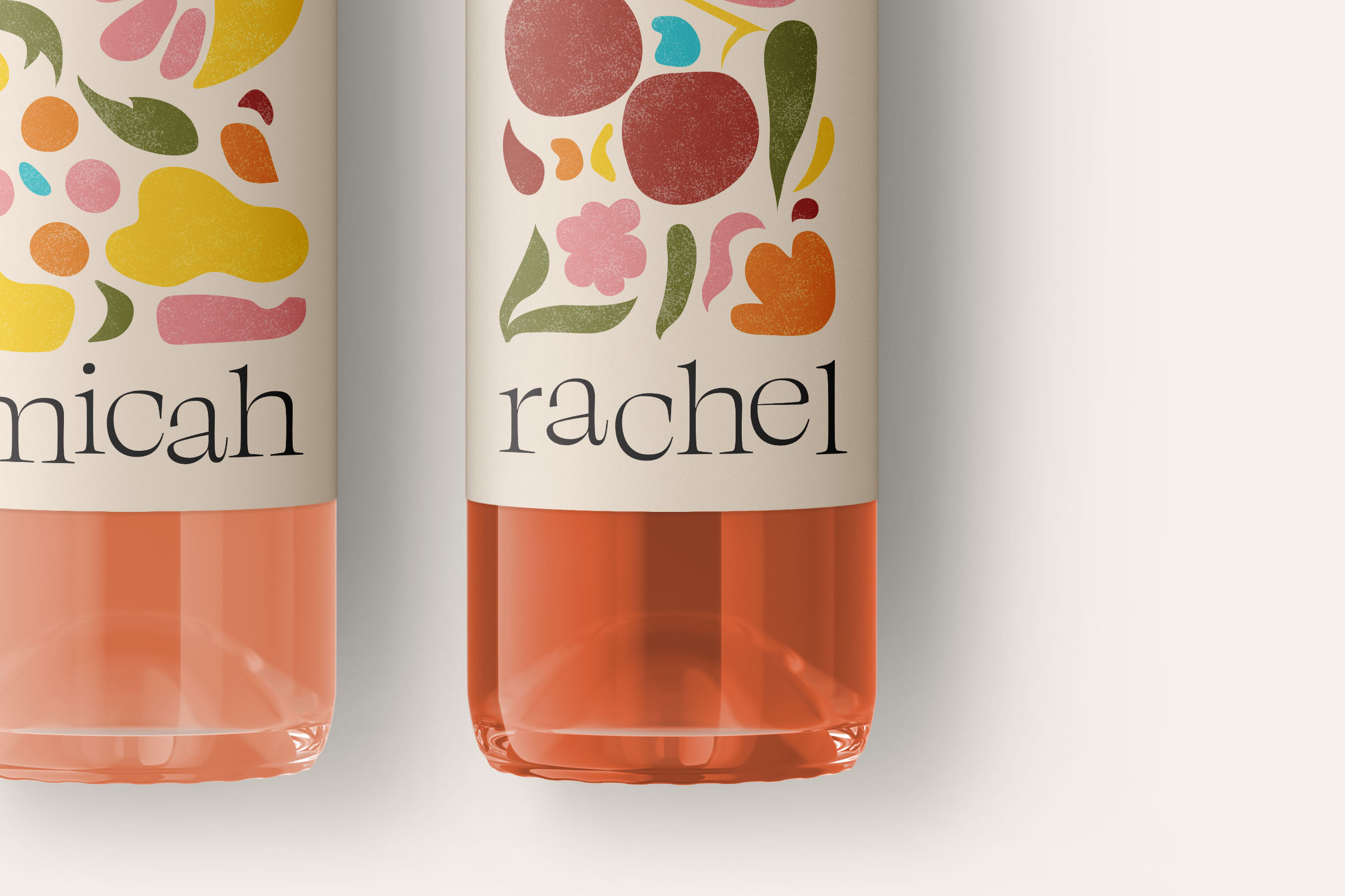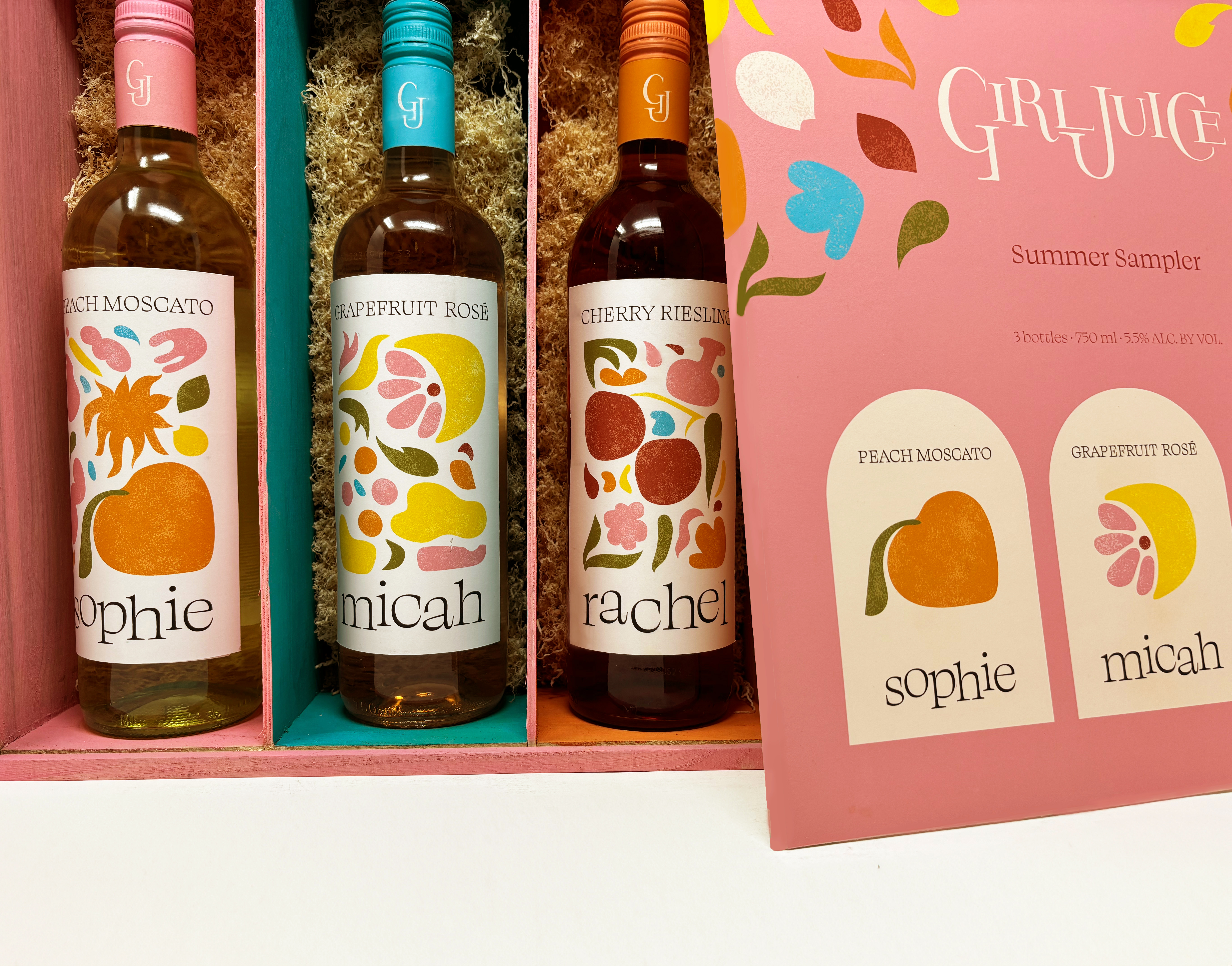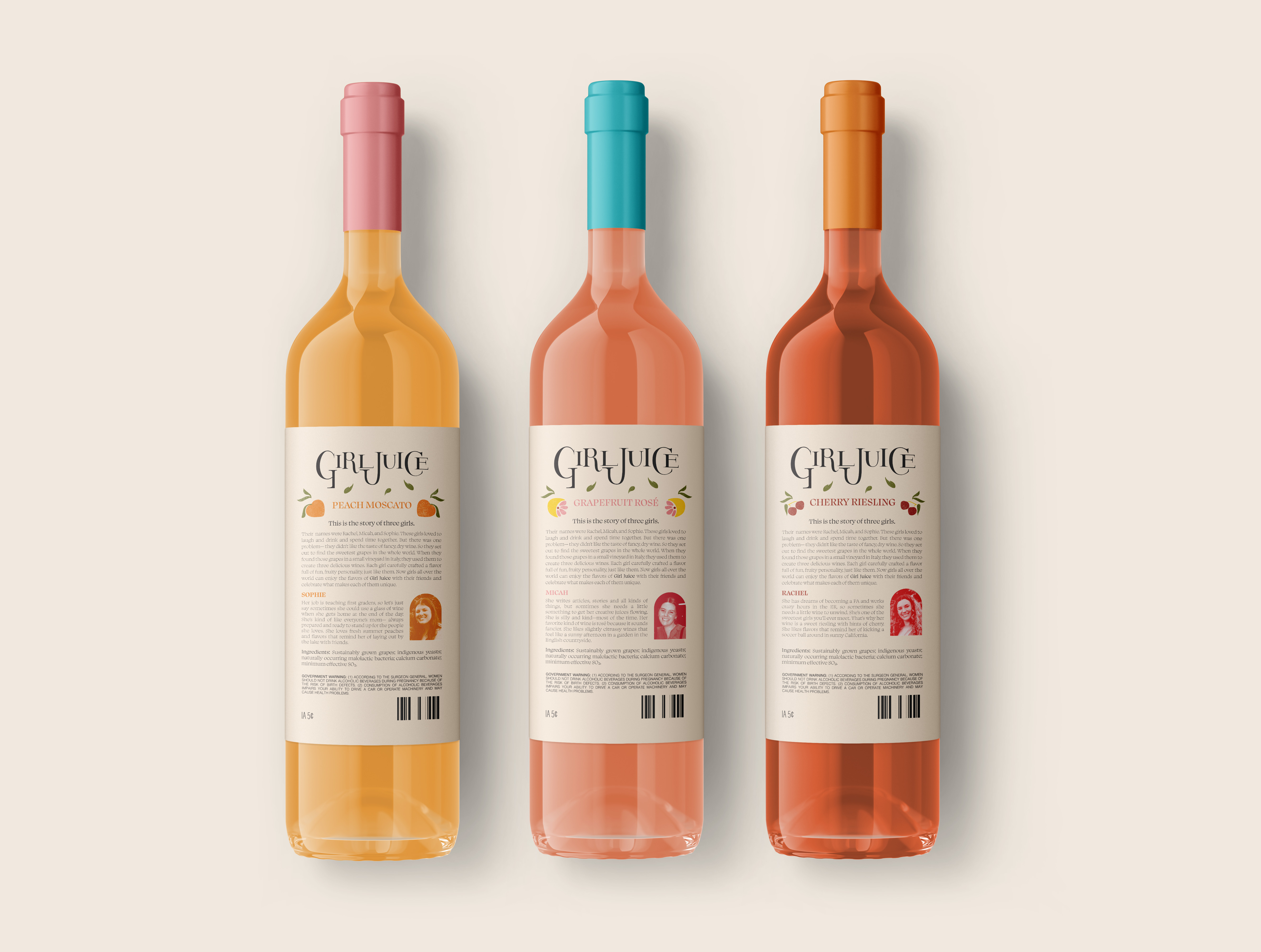 Girl Juice is designed for the girls who love to enjoy wine with friends, but don't like the taste of fancy, dry wine. Each flavor was named after and inspired by an important girl in my life. The Summer Sampler includes a variety of sweet white wines, including Sophie’s Peach Moscato, Micah’s Grapefruit Rosé, and Rachel’s Cherry Riesling. Each wine label also incorporates hidden images inspired by each girl’s personality. The system utilizes bright, feminine colors and funky shapes to signal that these aren’t some stuffy, sophisticated wines. Combined with an unconventional serif font and distressed textures, Girl Juice is full of personality, just like the girls who inspired it.
